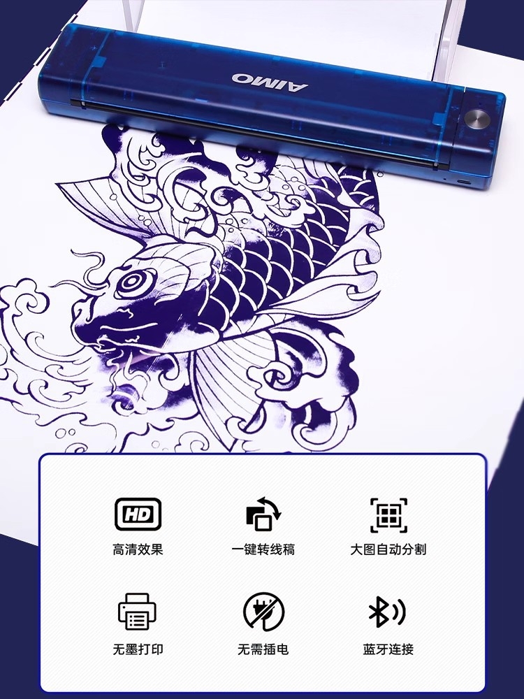 پرینتر رولی آیمو نسخه T08F/T08FS یک دستگاه حرارتی قابل حمل است که بهطور ویژه برای انتقال طرحهای تاتو (استنسیل) روی رول کاغذ طراحی شده. مهمترین ویژگی آن امکان چاپ تصاویر بلند و پیوسته تا هر طول دلخواه است، بدون نیاز به برش و چسباندن چند برگه.